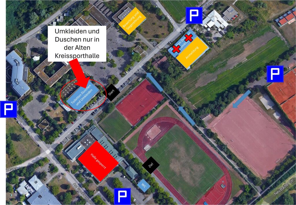 Bitte beachtet, dass die Wilfried-Dietrich-Halle in Schifferstadt auf Grund von Bauarbeiten voll gesperrt ist. Ebenso stehen die Duschen in der Neuen Kreissporthalle nicht zur Verfügung. Wir werden deshalb die Anmeldung in die Neue Kreissporthalle und die Bewirtung und Siegerehrung in die Aula des Schulzentrums verlagern. Wettkampfstrecken sind von der Änderung nicht betroffen.